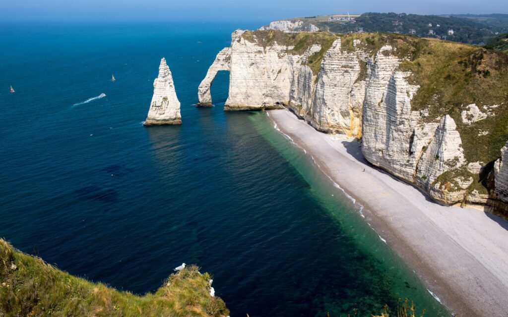 Étretat es uno de los mejores lugares para descubrir la costa de Normandía, con acantilados únicos y paisajes muy fotogénicos.
